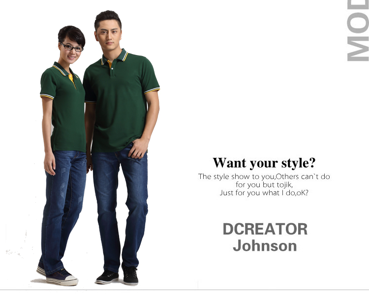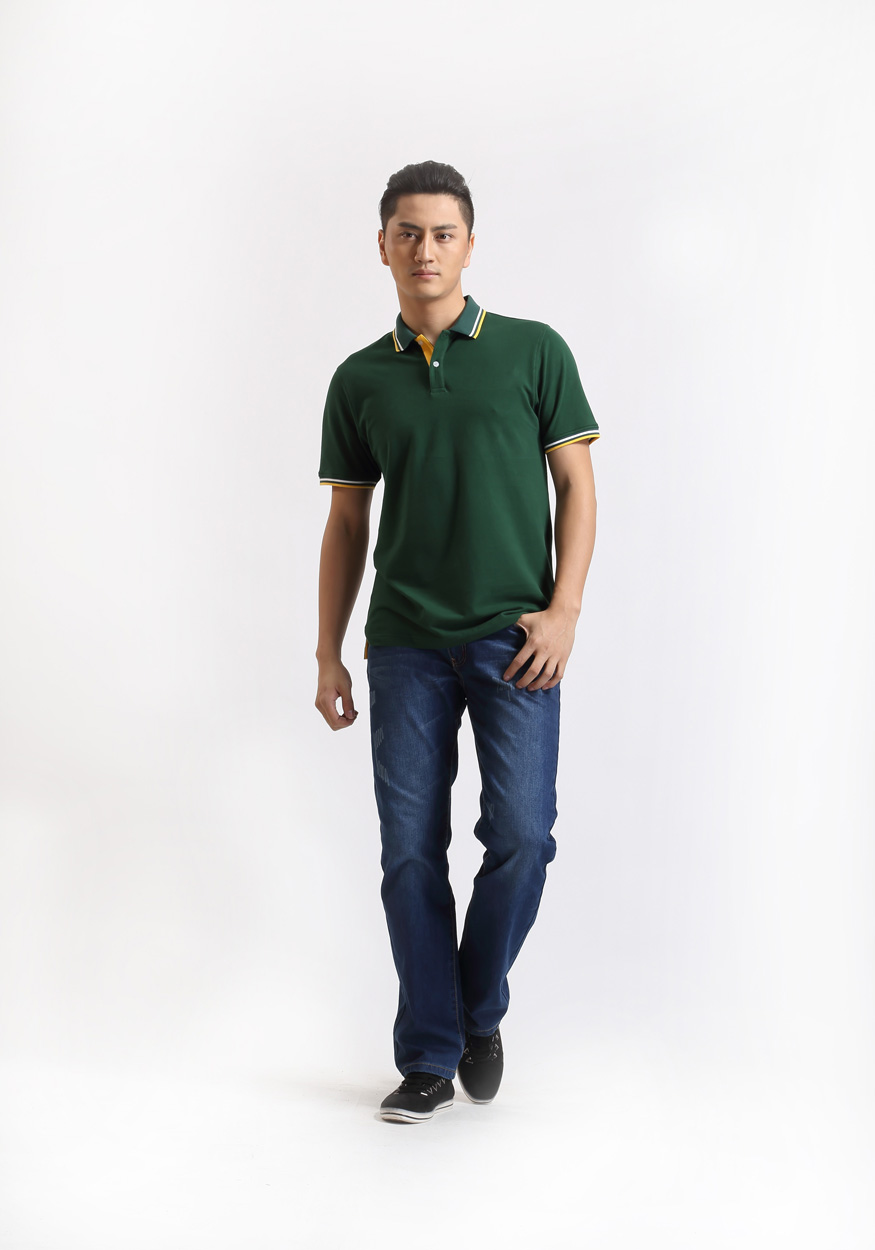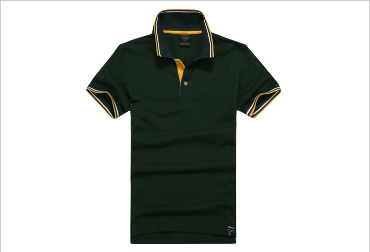 墨綠色珠地棉POLO衫款式,領(lǐng)袖間條撞色,男女時(shí)尚款定制