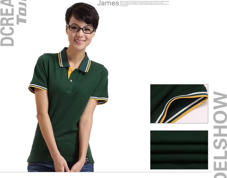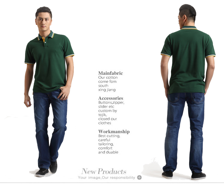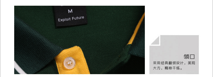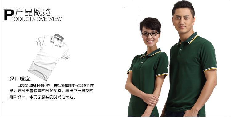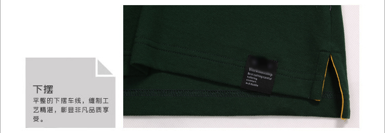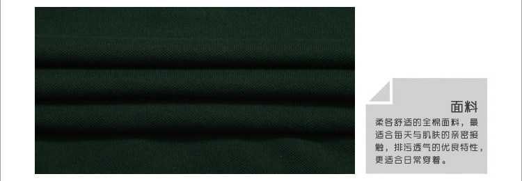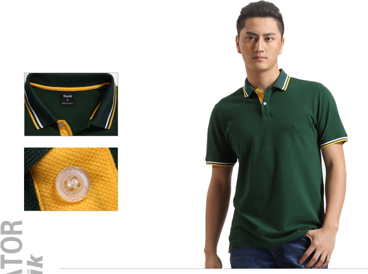 > 墨綠色珠地棉POLO衫款式,領(lǐng)袖間條撞色,男女時(shí)尚款定制