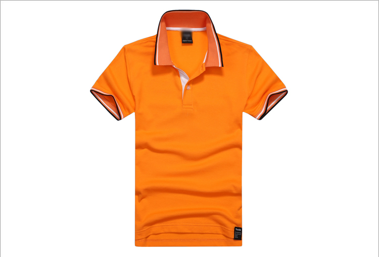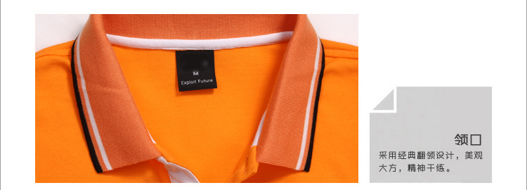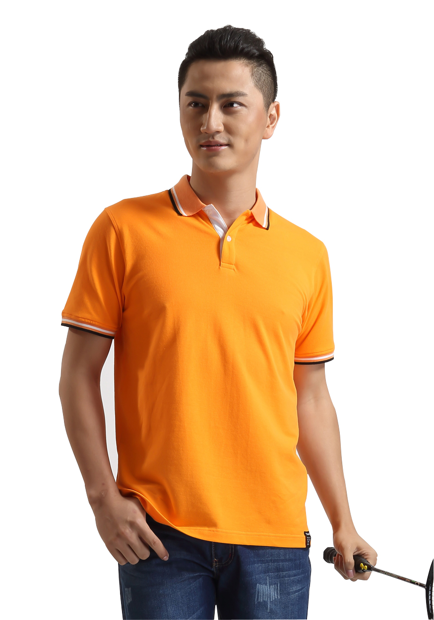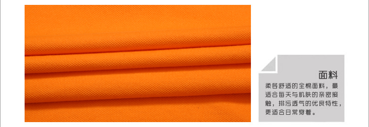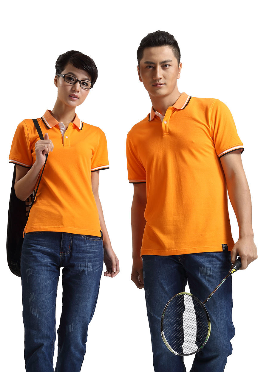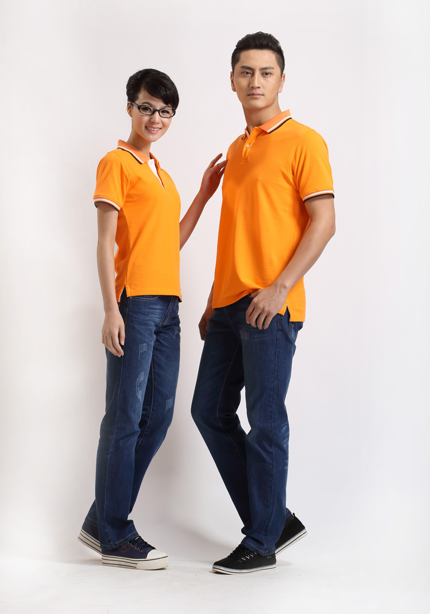 > 橙黃色珠地純棉POLO衫,領(lǐng)袖間條撞色,男女時(shí)尚款式定制