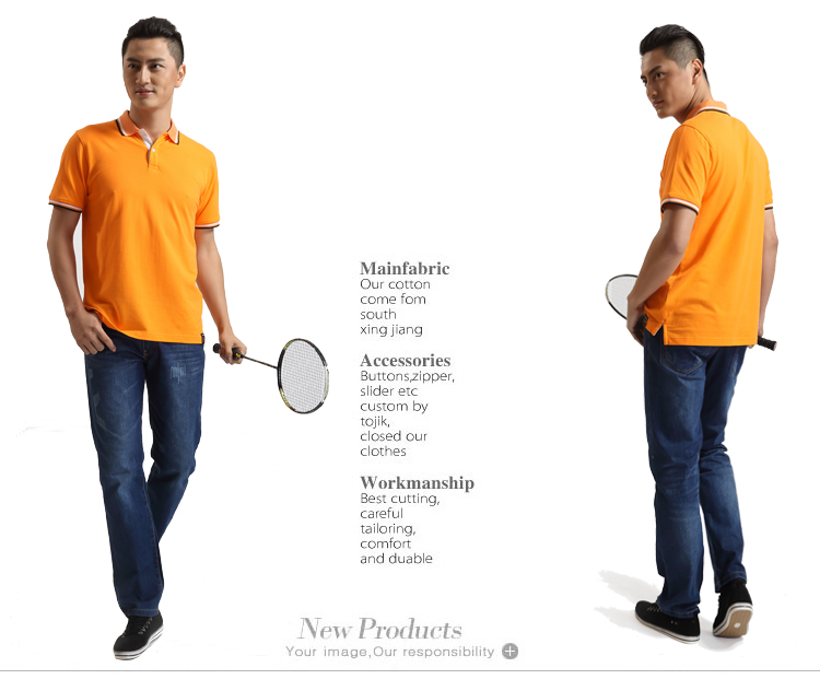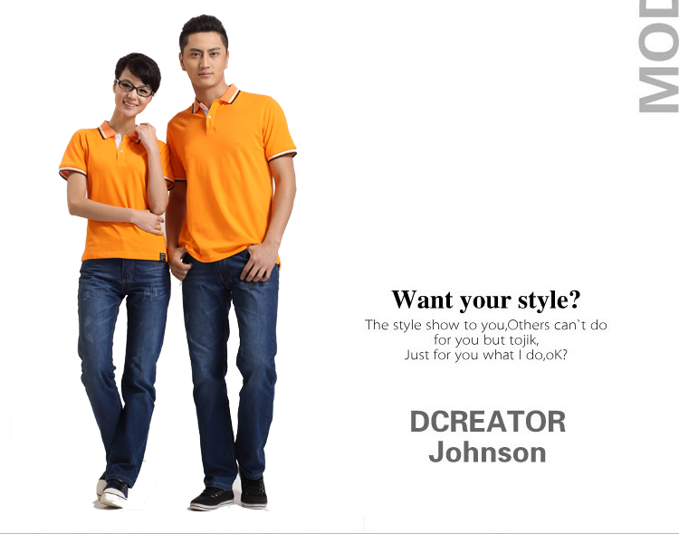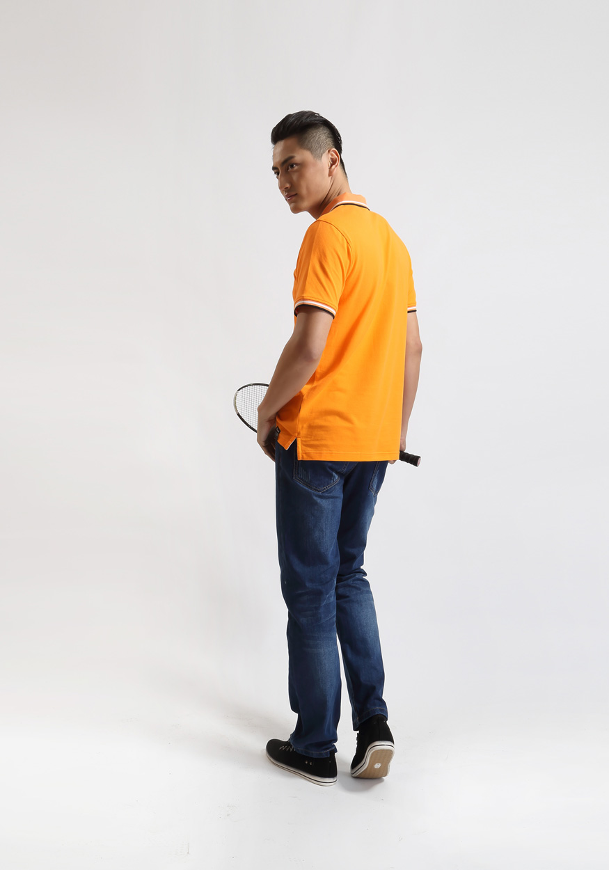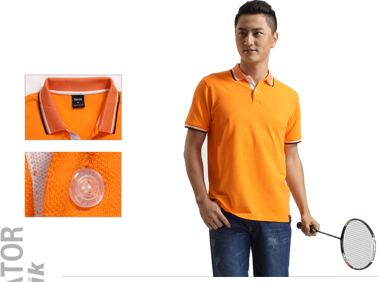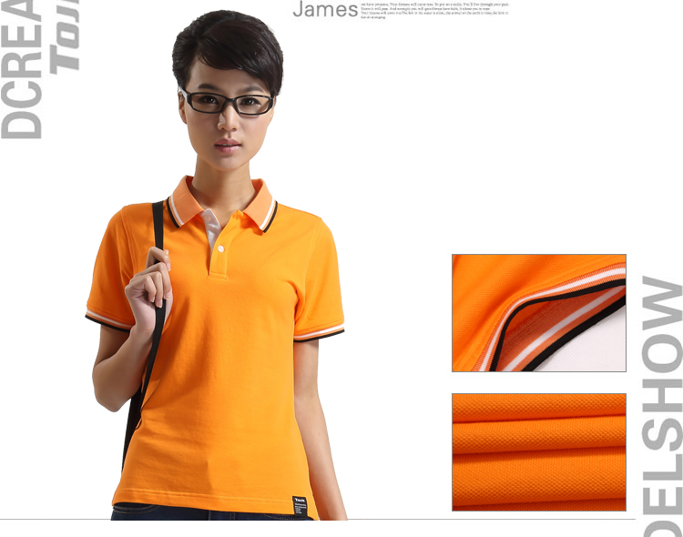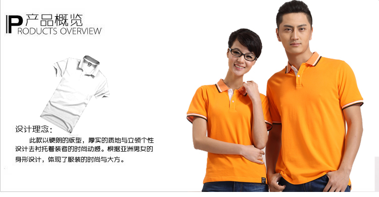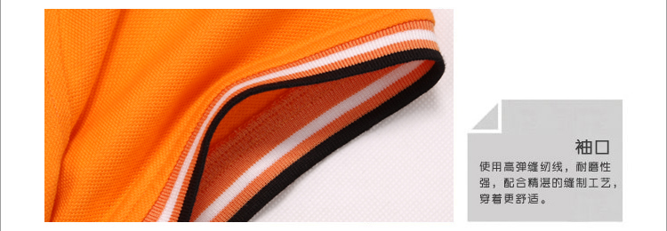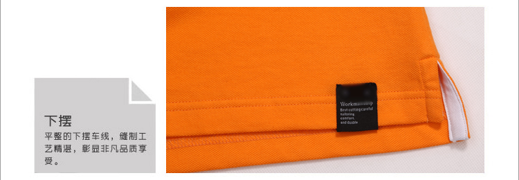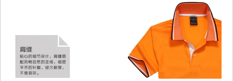 > 橙黃色珠地純棉POLO衫,領(lǐng)袖間條撞色,男女時(shí)尚款式定制