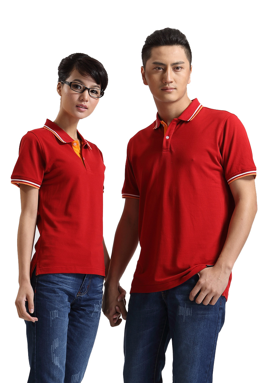 大紅色珠地純棉POLO衫,領袖間條撞色,門襟撞色男女款定制